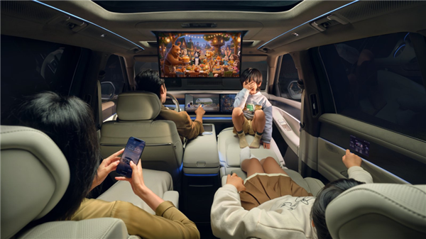 在车内氛围的营造上,也没有落下功课,车内有4个独立头枕音响,支持各座位分区独立听音及车载 K 歌功能;车外配置的独立发声单元,不仅用于行人警示,还支持车内外双向语音沟通及户外场景的音乐播放。