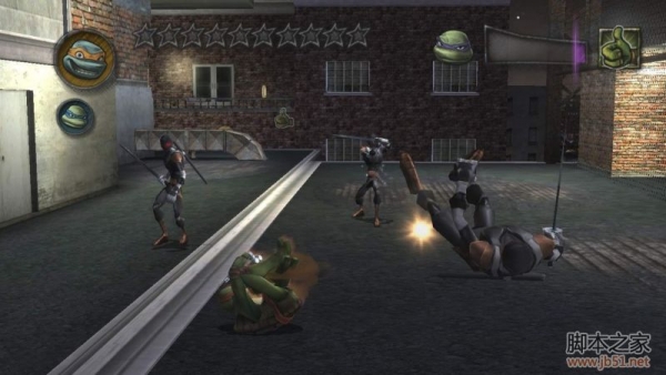 选择莱昂纳多进行剧情模式,打一个关卡和两个BOSS。除了轻重两种攻击,还可以投掷忍者镖、冲刺和使出冲天剑,最后这种攻击可以把敌人打到飞起,在落下之前还可以用轻招连续追击,有点儿格斗游戏的味道。比较遗憾的就是跳起踢腿并不像以前那样高高跃起然后很有力地斜着踢下来,而是伸出两只小短腿轻轻一点,很没劲。路上有一些箱子可以打碎,里面可能会有忍者镖,或者是甜甜圈、饮料等补血的食品,当然,忍者神龟们最爱吃的匹萨也会有。有时候是暂时增加速度、攻击力和防御力的道具,还有卷轴之类的,不知道有什么用。另外路边的汽车也可以破坏,油桶可以打飞、爆炸。