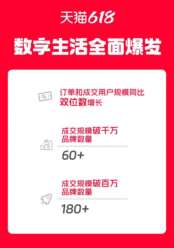 数据显示,数字生活行业订单和成交用户规模同比去年实现双位数增长。5个品牌成交规模破亿,同比去年实现超双位数增长;超60家品牌成交规模破千万,超180家品牌成交规模破百万,数量均超过去年,展现出强劲的市场活力。