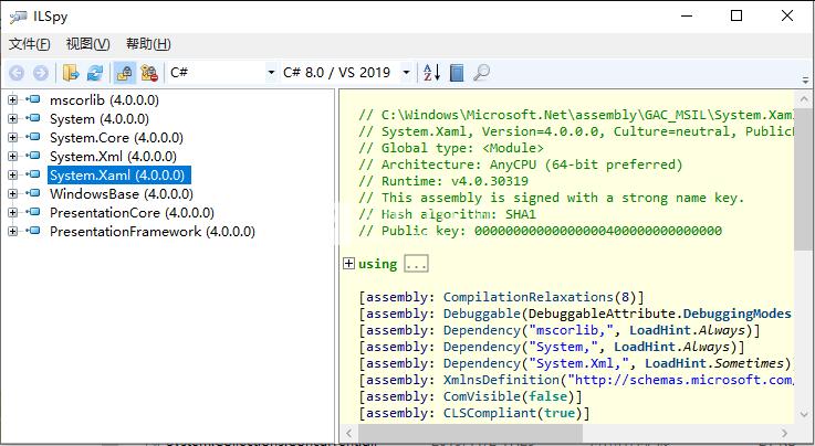 ILSpy 能够使用 C# 在 C#,IL 和 IL 中呈现代码。对于 C#,您可以选择 C#1.0/VS .NET 到 C#7.2/VS 2017。例如,您可以查看资源和引用,查看表以及将信息提取到文件。