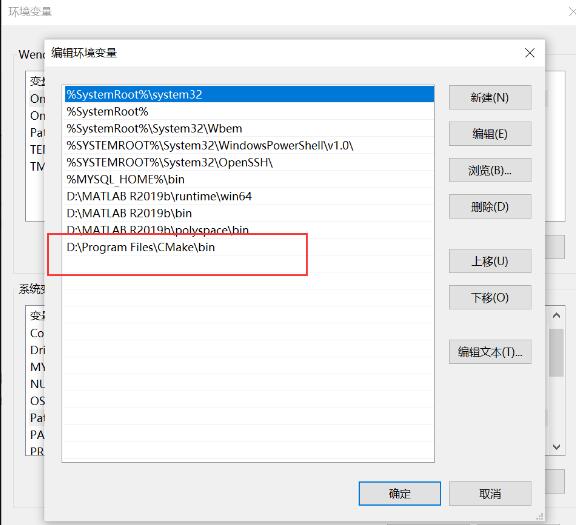 安装完成后,进入Windows系统环境变量设置对话框,可以看到,由于刚才的设置CMake已经自动将其安装路径“D:\Program Files\CMake\bin” 写入环境变量Path中。