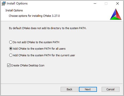 选中“Add CMake to the system PATH for all users”单选按钮添加系统路径变量。也可以同时勾选“CreateCMakeDesktopIcon”复选框,以便在安装完成后在桌面上创建CMake的快捷方式图标。