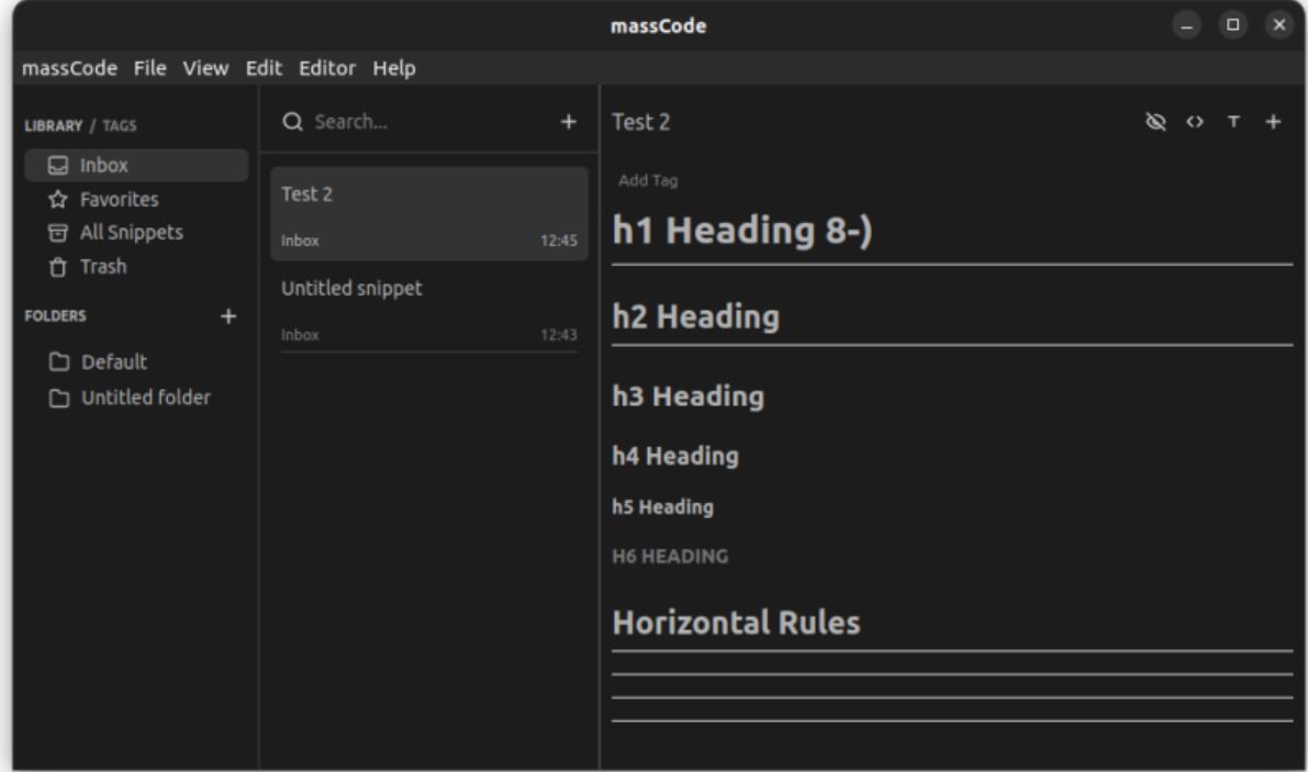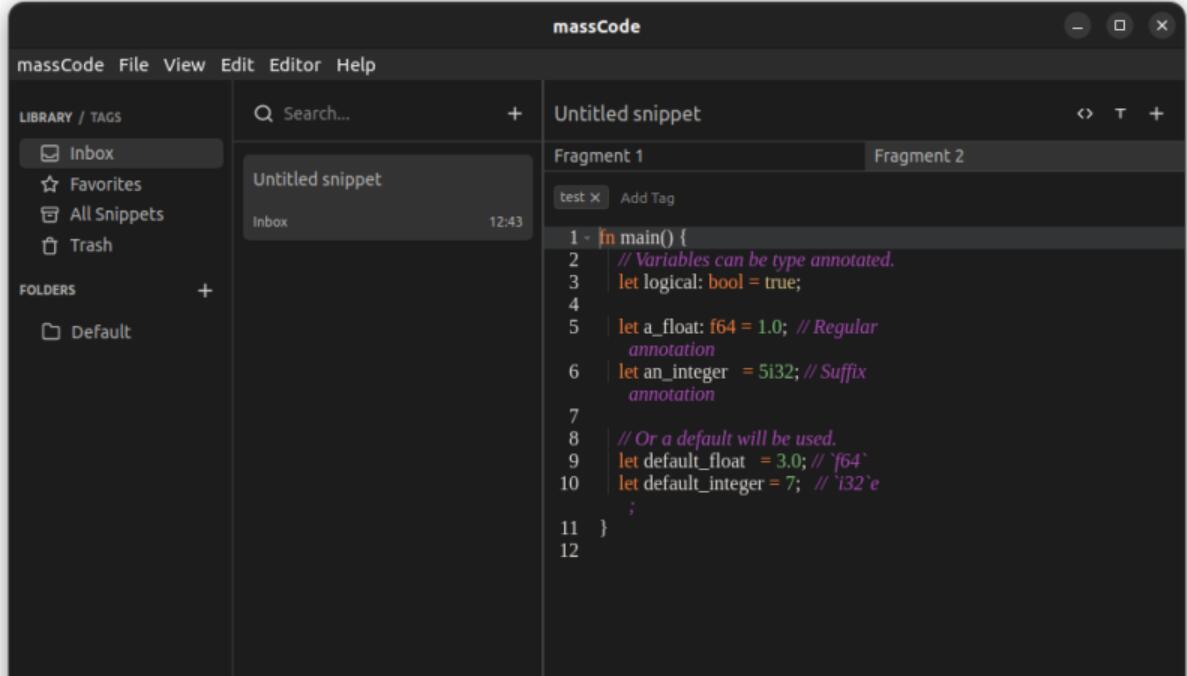 MassCode 是一个代码片段管理器,它支持广泛的编程语言,还包括对 Markdown 的支持。MassCode 可用于 Linux、Windows 或 macOS。MassCode 使用Codemirror作为编辑器的基础和.tmLanguage语法高亮的语法。这种串联打开了通向600 多种现有语法的大门。该应用程序目前支持160多种语法。除了.tmLanguage之外,该应用程序还支持.tmTheme主题。还支持Prettier进行代码格式化。