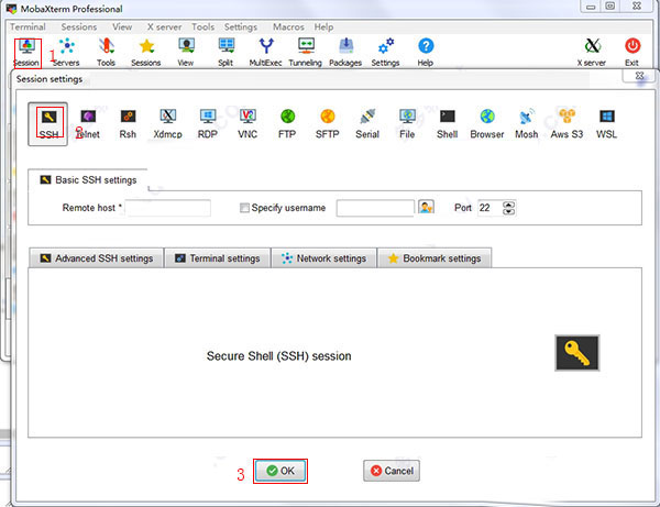 点击左上角的Session新建一个会话,在会话对话框中点击SSH,切换到SSH参数页。remote host填写远端服务器的地址,Specify username填写用户名,port填写端口,点击OK就可以登录到远端服务器了。