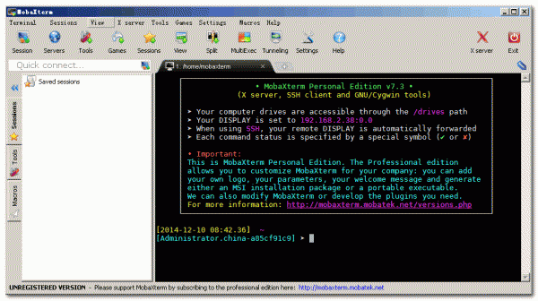 从这个控制台窗口,您将被允许运行您需要的Unix命令:ls,cd,grep,awk,tail,cut,sed,wget,rsync,telnet,ssh,rlogin,rsh …所有必需的Unix工具存在。如果您需要在基本MobaXterm文件中不可用的程序,则可以下载免费的插件。