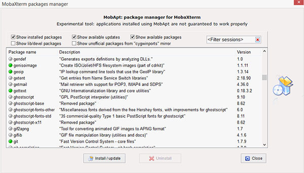 MobaXterm软件包管理器(MobApt / apt-get)允许您直接在MobaXterm终端中下载并使用更多的Unix工具。