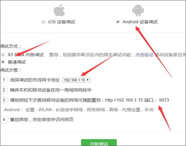 7、手机设置完毕代理以后,点击开发者工具页面中的开始调试就可以。