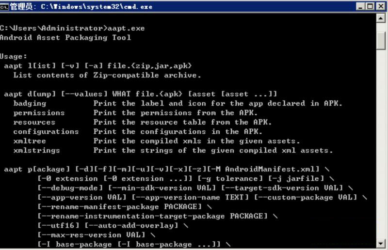 测试安装方法:命令行下运行aapt.exe