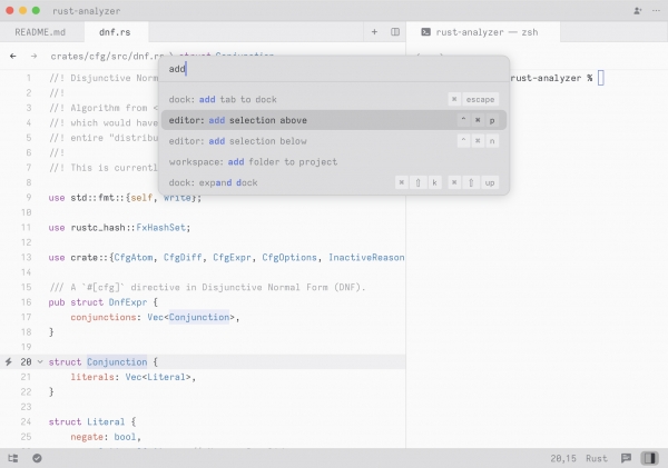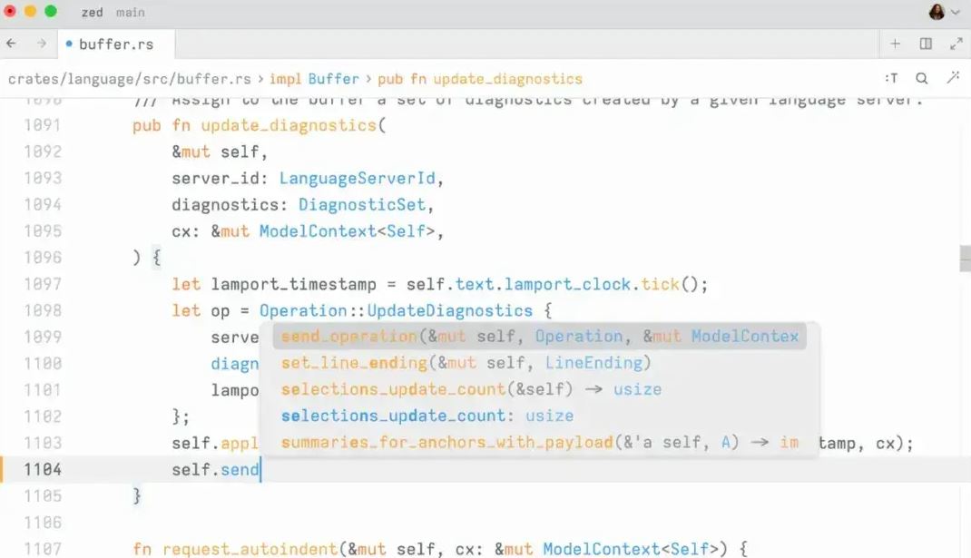 Zed 可在你输入时为每个缓冲区维护完整的语法树,从而实现精确的代码高亮显示、自动缩进、可搜索的大纲视图和结构选择。Zed 还能使用语言服务器协议,提供自动完成、代码导航、诊断和重构功能。