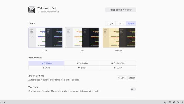 安装完成后,你可以在应用程序菜单中找到 Zed 并启动,或在终端中运行。首次启动时,Zed 会显示欢迎界面,你可以选择是否导入其他编辑器的配置。