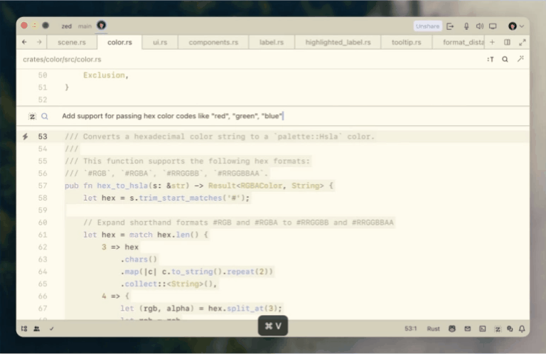 Zed Editor 以一种全新的视觉美感进入人们的视野。其简洁现代的界面旨在提供无干扰的编码体验。Zed 采用无标签方式,利用以文档为中心的模式,这可能会吸引那些寻求无杂乱工作空间的开发人员。编辑器的界面反应灵敏,可实现无缝编码。