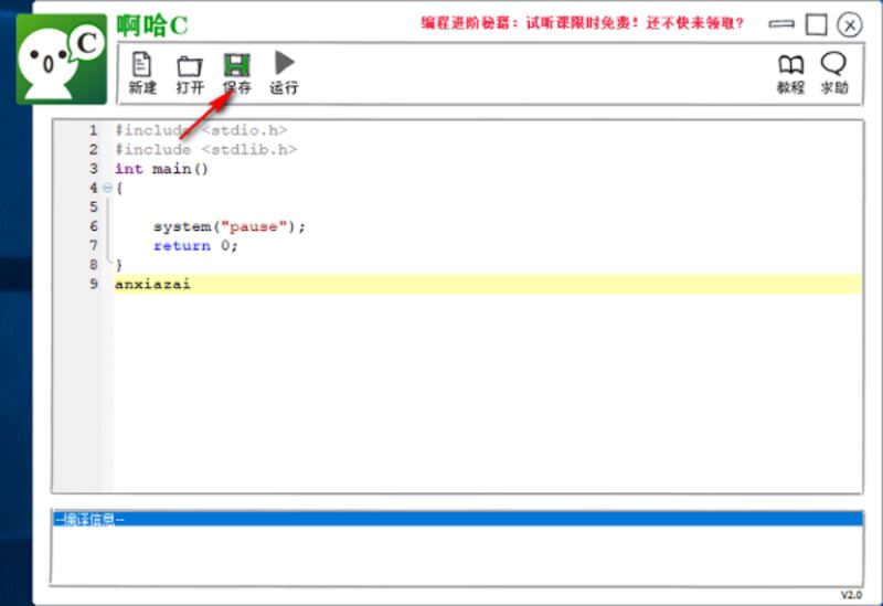 4、输入完成后,点击啊哈C菜单栏中的保存,选择文件的保存位置就可以了。