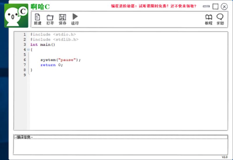 啊哈c语言是一款极为简单的c语言编程软件,该程序使用gcc内核编译,能够支持语法高亮,代码折叠,编译错误提示等功能,拥有新建,打开,保存,运行四个菜单,非常简单,便捷,而且是完全免费的,非常适合小学生学习c语言的入门时使用。如果您的孩子正在学习C语言的初级阶段,那么这款啊哈c客户端绿色版将非常适合您,无需安装,打开即用,变异方面也没有任何问题,有需求的用户请下载体验。