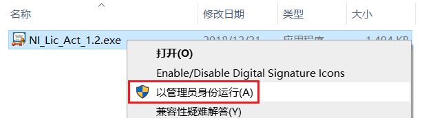 16.然后找到NI_Lic_Act_1.2.exe,鼠标右击选择【以管理员身份运行】,注意:一定要以管理员身份运行,否则易安装失败