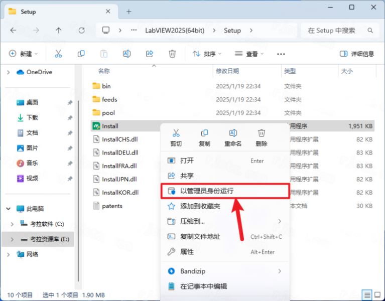 2、以64位为例,将其解压,右击【Install】选择【管理员身份运行】;