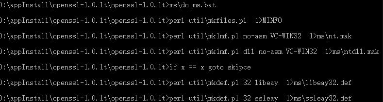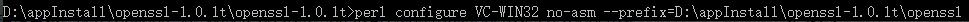 安装到指定目录:perl configure VC-WIN32 no-asm –prefix=D:\appInstall\openssl-1.0.1t\openssl