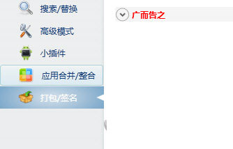 我们将APK文件导入到软件中后,可以先选择左边的功能栏中进行源码修改,完成好后,选择下方的【打包签名】。