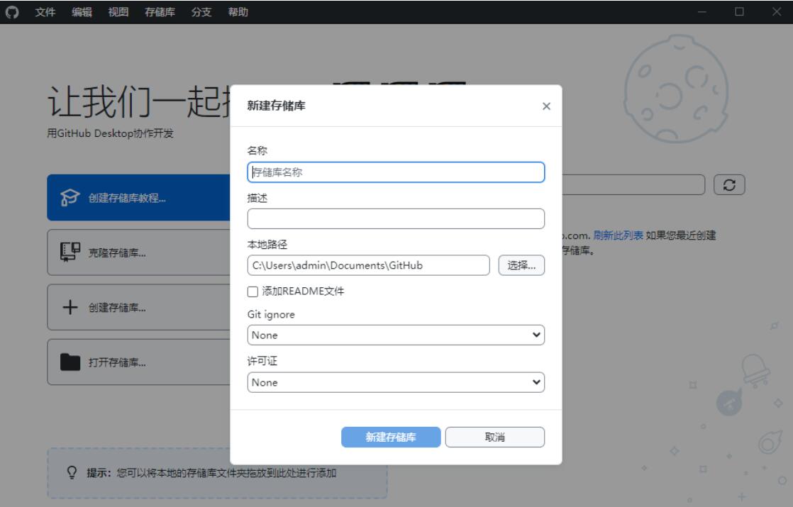 2、如图所示,这里是软件的功能界面,可以创建一个新的储存库