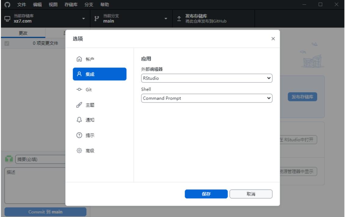 5、集成设置功能,可以选择外部编辑器RStudio,可以添加Shell工具Command Prompt