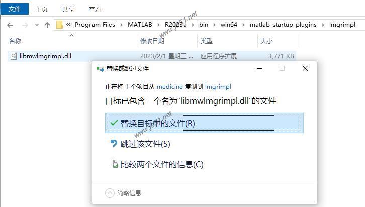 7、将medicine文件夹中的libmwlmgrimpl.dll复制到安装目录下替换即可,默认路径 \bin\win64\matlab_startup_plugins\lmgrimpl