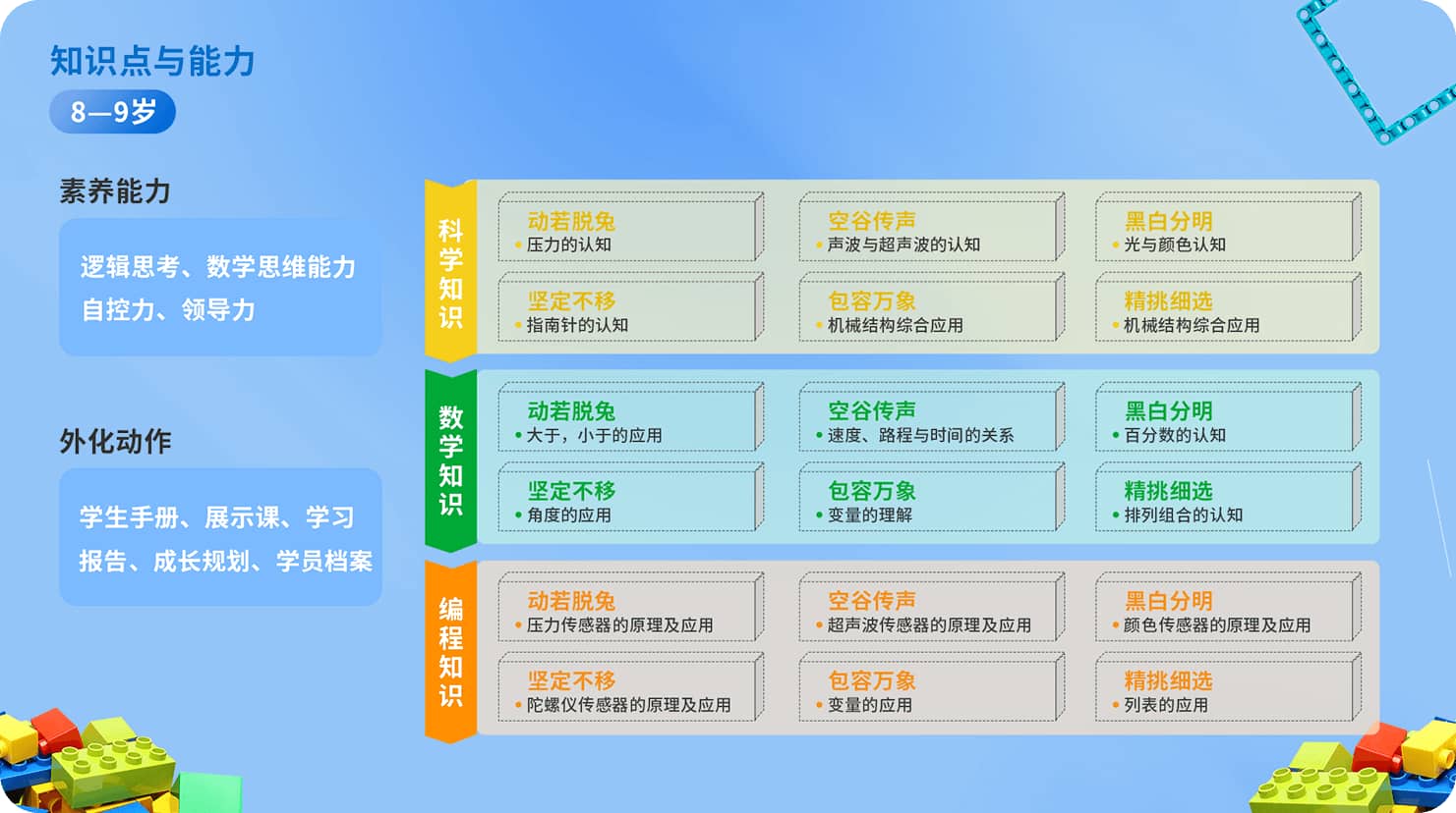 2、课程内容不是以赛事为唯一的出发点,同时基于4-10岁小朋友的常见问题,针对问题研发解决方案,从而培养孩子科学素养能力,让孩子有解决日常问题的能力。