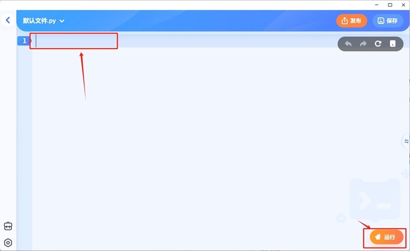 2、在空白操作页面上方输入代码,完成后可以【运行】操作一下,最后【保存】该作品