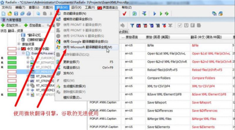 四、在“翻译”菜单选择微软的翻译引擎,谷歌的无法使用,在使用翻译引擎中,鼠标不能点击Radialix 3界面,否则会卡住(这一步先查看注意事项),如下图: