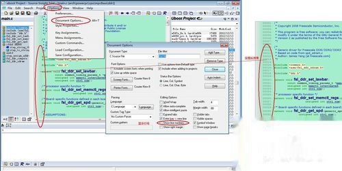 3、如下图左侧,Source Insight默认不显示代码行号,但是我们编译代码报错都是直接指出错误在哪一行的,为了方便,常常将下面的行号配置出来,这样用起来比较直观。“Options”——“Document Options…”,选择下面的“Show line numbers”,这时行号就显示出来了。