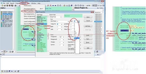 4、在上面的工程中,你有没有觉得文字太小,看着有点累眼睛?下面把字号改大一点。这个改字号要分类进行,比如我们先选中“#include”字样,则进入“Options”——“Style Properties…”,后,可以看到界面上选择的是“keyword”,之所以选中这个是因为我们进入前选中了#include。在右侧“size”处下拉选择合适的字号,现在我选择了12号,确定后效果如下图右侧所示,请注意下include文字的大小已变,而其他类别字号未变。其他各个类型请自己试一试吧。