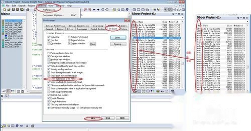 1、Source Insight默认配置为将工程中的文件名都列成首字母为大写的,如图左侧工程文件列表中显示。现在我们将它配置成维持原文件的大小写不变的显示方式。如图,“Options”——“Preferences”——“Display”,下面有一个“Show exact case of the names”,勾选确定后,显示如图形右侧所示。