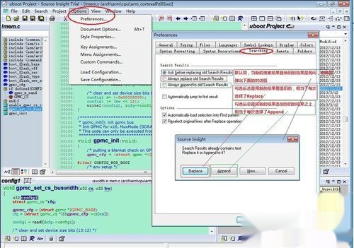 6、搜索也是Source Insight使用频率最高的一个功能了,默认情况下每次搜索就会弹出一个菜单来询问你是要覆盖上一次的搜索结果,还是追加到上次的搜索结果中,如果是阅读一个较大的工程,常常使用搜索,他每次询问也挺烦的。所以可以设置一下,一劳永逸。如下图,“Options”——“Preferences”——“Searching”中上面有三个选项,图中分别作了解释。请根据需要设置。