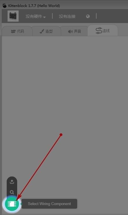 点击打开后可以看到一张空的画布,在最左下角有一个”+”图标。这个是用于导入电路板或电子模块图片的,目前只支持png格式,导入的图片将以1:1的形式绘制在画布上。在Kittenblock安装目录下的wiring目录有一些我们已经画好的主板和电子模块图片,大家可以自由使用。