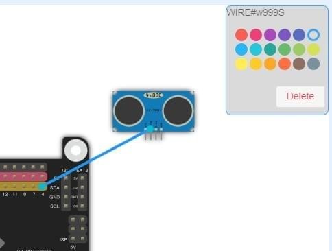 当两个引脚连接上后即使我们拖动电子模块也会自动跟随更新新的位置。目前引脚和导线可以更换颜色,具体操作是先点击导线或者引脚,在右上角弹出来了一个颜色选择框点击对应颜色就可以了~