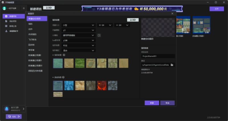 场景大小:你可以通过下拉菜单设置场景的宽度(W)和长度(H),数值越大则场景越大,但是消耗的资源也就越多。当然,进入项目后,你也可以通过细节-地图设置-地图大小 进行更改。