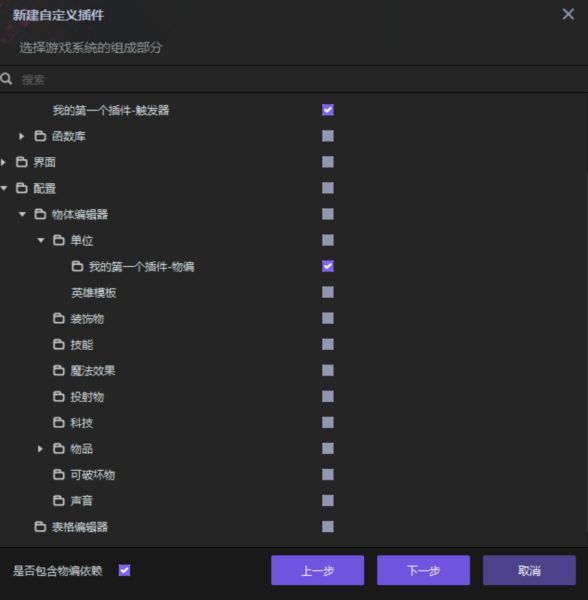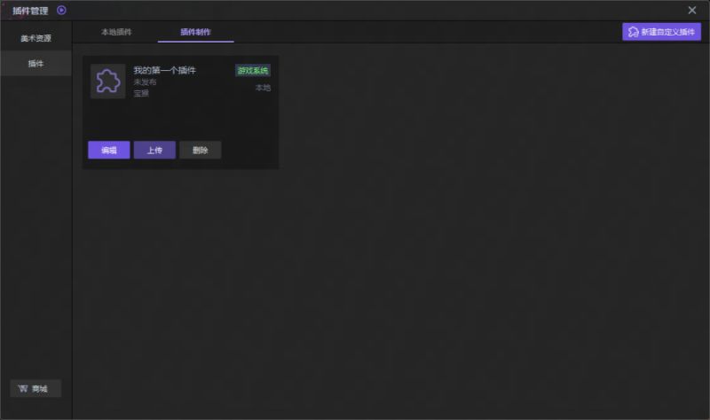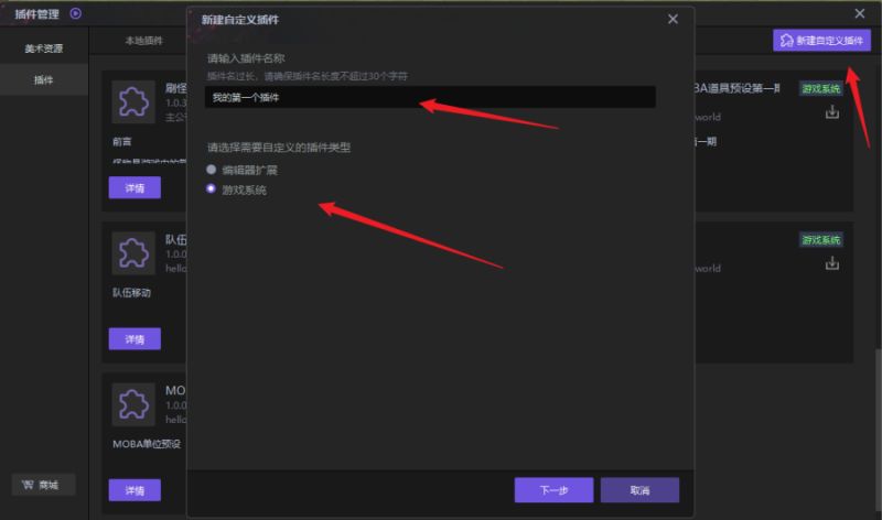 点击按钮【新建自定义插件】,填写插件名,勾选选项【游戏系统】,点击下一步
