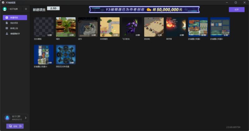 开启编辑器即可进入启动页。你可以点击启动页的“空白模板”选项从零开始新建一个项目,也可以点击选择官方提供的模板,直接进行游玩或为你的项目提供思路与程序基础。