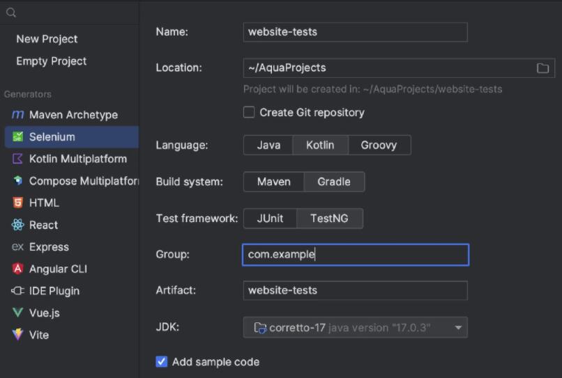 Aqua 可以为 JVM 堆栈生成新的 UI 测试项目,用户可以在 New Project(新建项目)向导中指定 JDK、构建工具(Maven 或 Gradle)、测试运行程序(JUnit 或 TestNG)和语言。