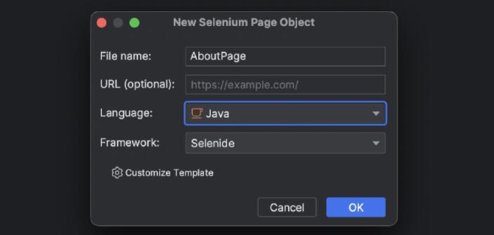 在采用页面对象模式时,IDE 可以帮助用户从 New File(新建文件)菜单创建并维护新的页面对象文件,并且在添加定位 器时遵循所选页面对象模式。