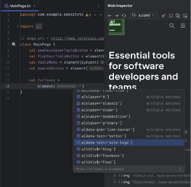 当 Web 检查器激活时,CSS 和 XPath 代码补全将提示并高亮显示最重要网页元素的定位 器。