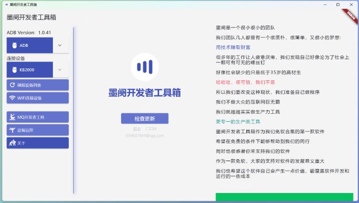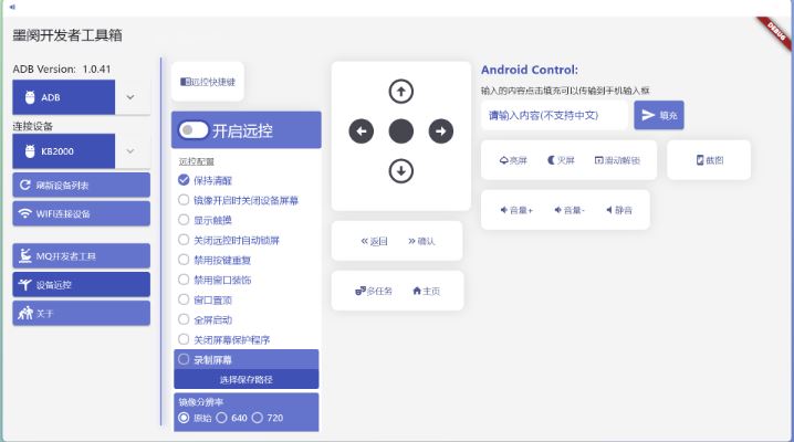 墨闵开发者工具箱 是一款能控制 Android 设备的生产力工具,专为开发者/测试/极客用户设计。它集成上百种操作,旨在通过PC高效操控设备,大幅提升开发和测试效率,无论是企业设备、无触控机器,还是小屏设备和无屏设备,墨阈开发者工具箱都能为您提供卓越的管理体验。墨阕开发者工具箱的功能主要分为三大类包含:设备连接,MQ开发者工具,设备远控(支持有线无线实现电脑端操作设备)。