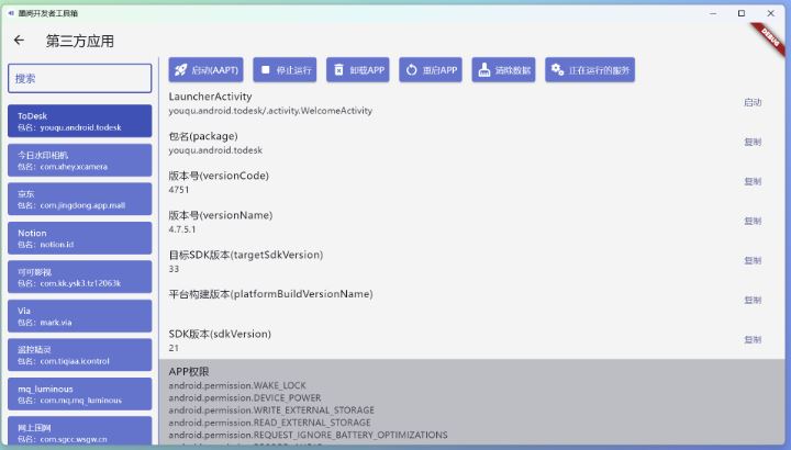 读取所有的第三方应用,并且支持停止运行/卸载APP/清除数据/获取正在运行的服务/启动指定Activity/获取APP信息/读取静态广播/读取权限/读取ContentProvider信息等操作