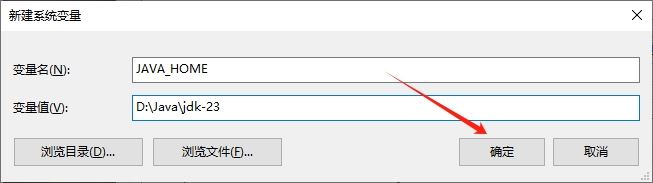 变量值:D:\Java\jdk-23 (变量值是JDK的安装路径)