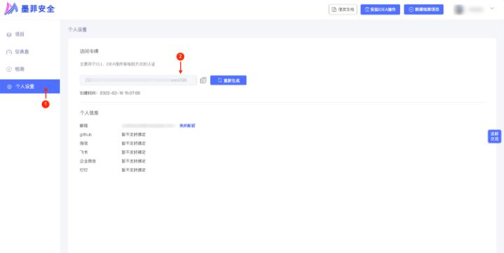 进入墨菲安全控制台 (opens new window),点击个人设置,复制页面中的访问令牌: