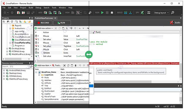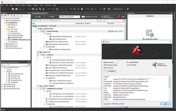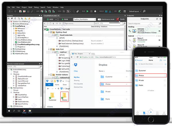 ranorex studio是ranorex系列软件的新版本,也是目前互联网上专业的gui自动化测试工具,拥有完整的工具集,可以用于在单一许可证中进行桌面,Web和移动应用程序的端到端测试,包括在Windows桌面上自动执行测试,然后在真实的iOS或Android移动设备或模拟器/仿真器上本地或远程执行测试,还可以在Chrome,Firefox,Safari,Microsoft Edge等的跨浏览器测试,从而更好的测试你的新软件。