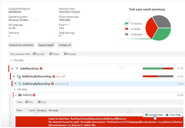 通过对测试执行流程的概述来监控测试结果,包括饼图,屏幕截图以及测试人员,开发人员和项目经理都可轻松读取的详细错误日志。在Ranorex Studio中查看综合测试报告,将其保存为PDF或自动将其作为电子邮件附件接收。自定义报告以适应您的需求。生成与JUnit兼容的报告,以便与CI工具轻松集成。通过直接从测试报告跳转到失败的测试步骤来减少调试时间,或者在测试仍在运行时使用维护模式来即时修复测试。