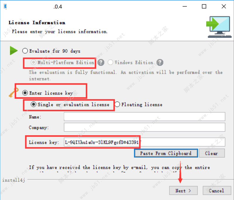 7.按如图选择,选择Install4 Multi-Platform Edition,选择single or evaluation license 填写用户信息,并将记事本内的注册码输入到license key,点next