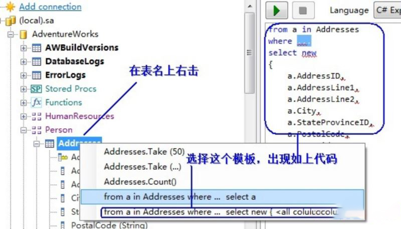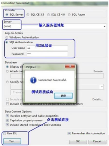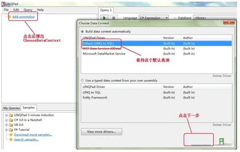 先看下如何连接数据库,运行LINQPad按下图进行操作,
