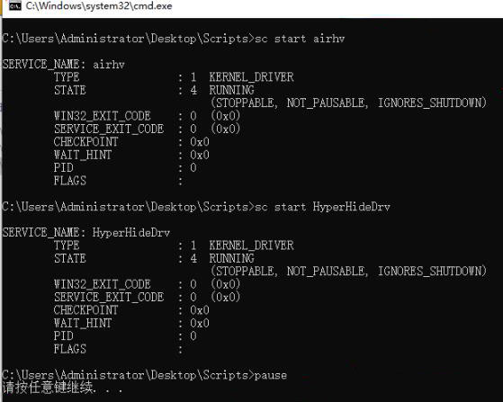 将 HyperHideDrv.sys 和 airhv.sys放入 C:\Windows\System32\drivers,然后打开存储库中的 Scripts 文件夹,并使用管理员权限执行 create.bat。为了打开两个驱动程序,请打开执行.bat具有管理员权限。如果要同时关闭 airhv 和 HyperHideDrv 执行.bat管理员权限(请记住在关闭驱动程序之前关闭所有 x64dbg/x32dbg 实例)。