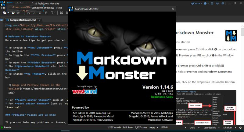 Markdown Monster是一款简单好用的编辑器,又叫做Markdown怪物,它可以打开Markdown文件并进行编辑,支持代码高亮显示,Markdown Monster的预览窗格可让您查看降价文本在呈现为HTML时的样子。Markdown Monster的预览窗格可让您查看降价文本在呈现为HTML时的样子。Markdown Monster还可以将您的Markdown直接发布到您的Weblog。如果您的博客支持WordPress,MetaWeblog或Medium,则只需单击一下即可发布文档。您还可以编辑和重新发布或下载现有帖子,甚至可以将现有帖子从HTML转换为Markdown。可通过.NET Addins扩展,编辑器具有高度可扩展性,因此您可以添加自己的自定义功能。 Markdown Monster包含一个插件模型,可以轻松构建扩展,让您可以进入UI,编辑器行为和发布过程。我们还提供有用的.NET Scripting和Text Templating插件,使您可以自动执行许多任务而无需创建插件。了解有关使用.NET创建插件的更多信息,Markdown Monster支持编辑各种文本文件格式,支持语法着色Markdown文本,键入时实时预览,内联拼写检查,轻松的图像和链接嵌入等,功能非常丰富!