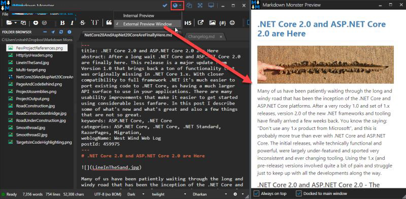 默认情况下,预览窗口位于Markdown Monster主窗口的内部: